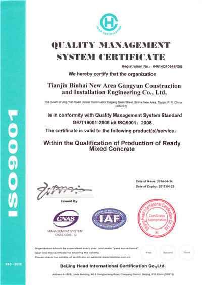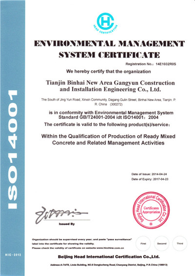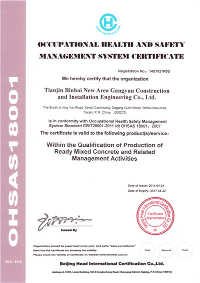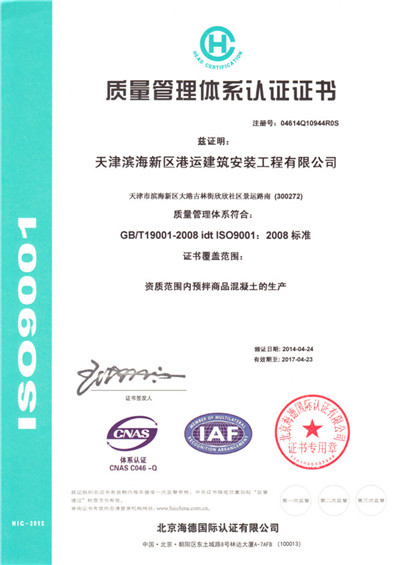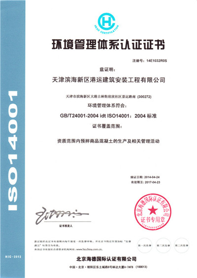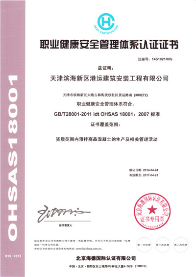 2014年4月,公司收到北京海德國際認證有限公司頒發的體系認證證書。至此,公司的子公司——天津濱海新區港運建筑安裝工程有限公司取得了ISO9001(質量管理體系)、ISO14001(環境管理體系)、OHSAS18001(職業健康安全管理體系)等三個體系的認證。