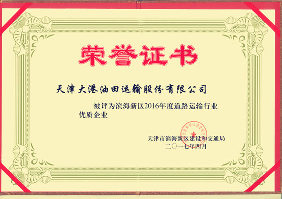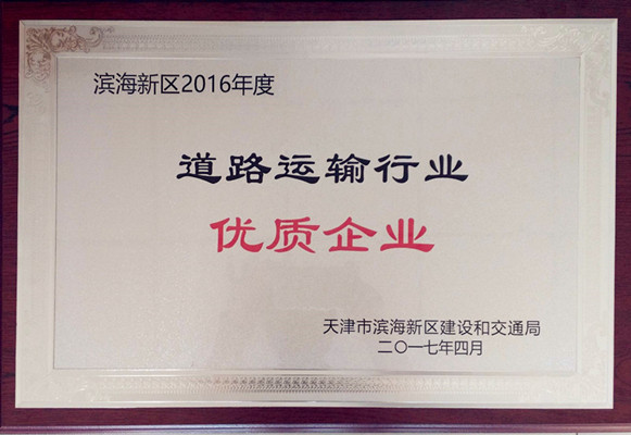 2017年4月,我公司被天津市濱海新區建設和交通局評為“2016年度道路運輸行業優質企業”。